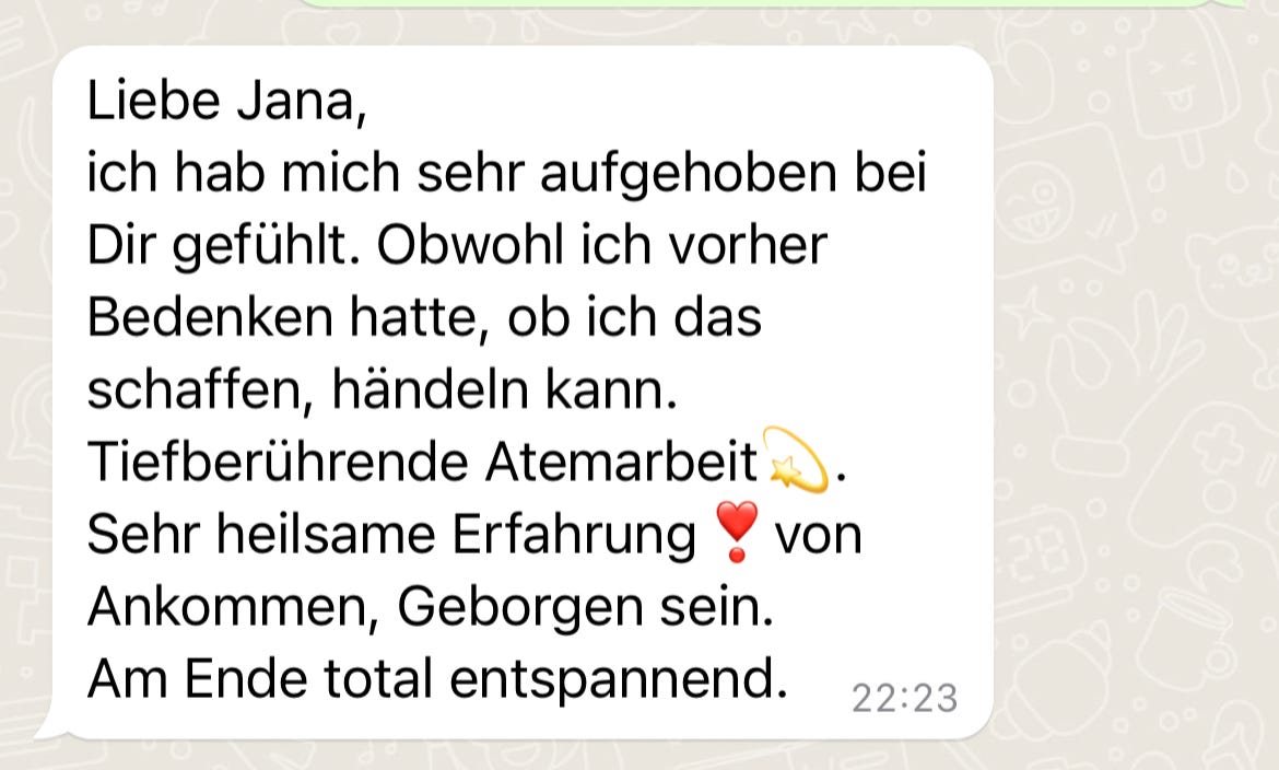 Da bei dieser Atemarbeit sehr viel hochkommen kann an Emotionen und auch Traumata, ist es mir wichtig, nur in Person und nicht online diese wirkungsvollen & transformativen Sessions anzubieten, um verantworts-und respektvoll die Tiefe deines Prozesses begleiten zu können.